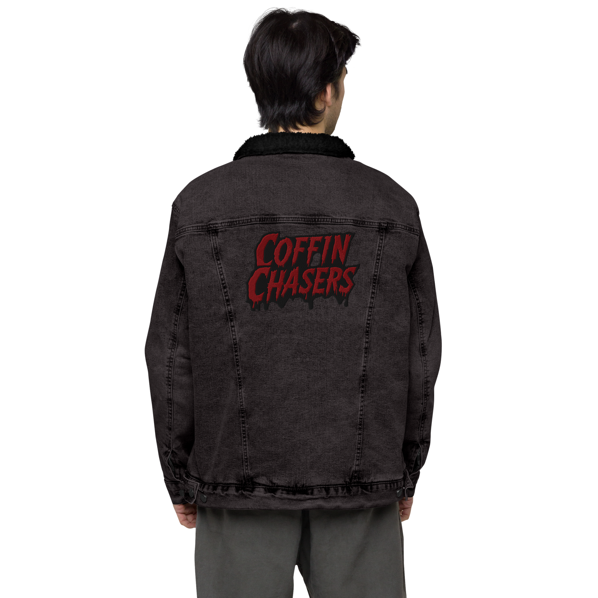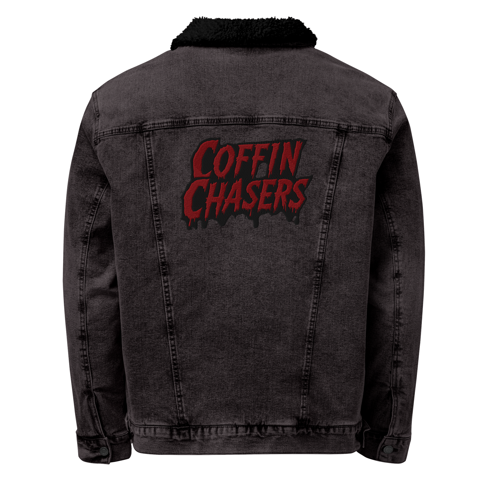 Coffin Chasers Denim Sherpa Jacket: 99% cotton, 1% spandex, 12 oz heavyweight, and lined for warmth.
